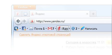 Уведомления из социальных сетей Яндекс.Бар расскажет, что нового в вашем интернете: уведомления из социальных сетей* Вконтакте, Facebook, Мой Мир прямо в Firefox. Бар также расскажет о новых письмах в Яндекс.Почте, Mail.ru и Gmail. * Уведомления из социальных сетей доступны при установке соответствующих кнопок из Библиотеки Яндекс.Бара. | ![]() |